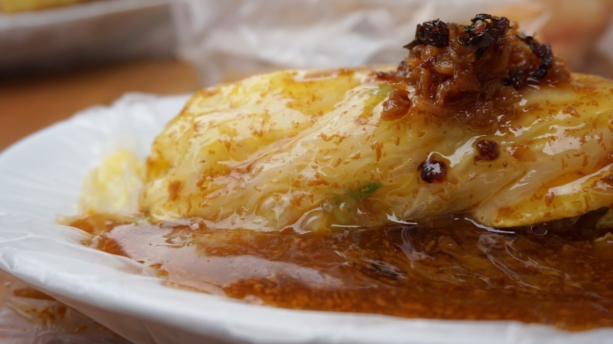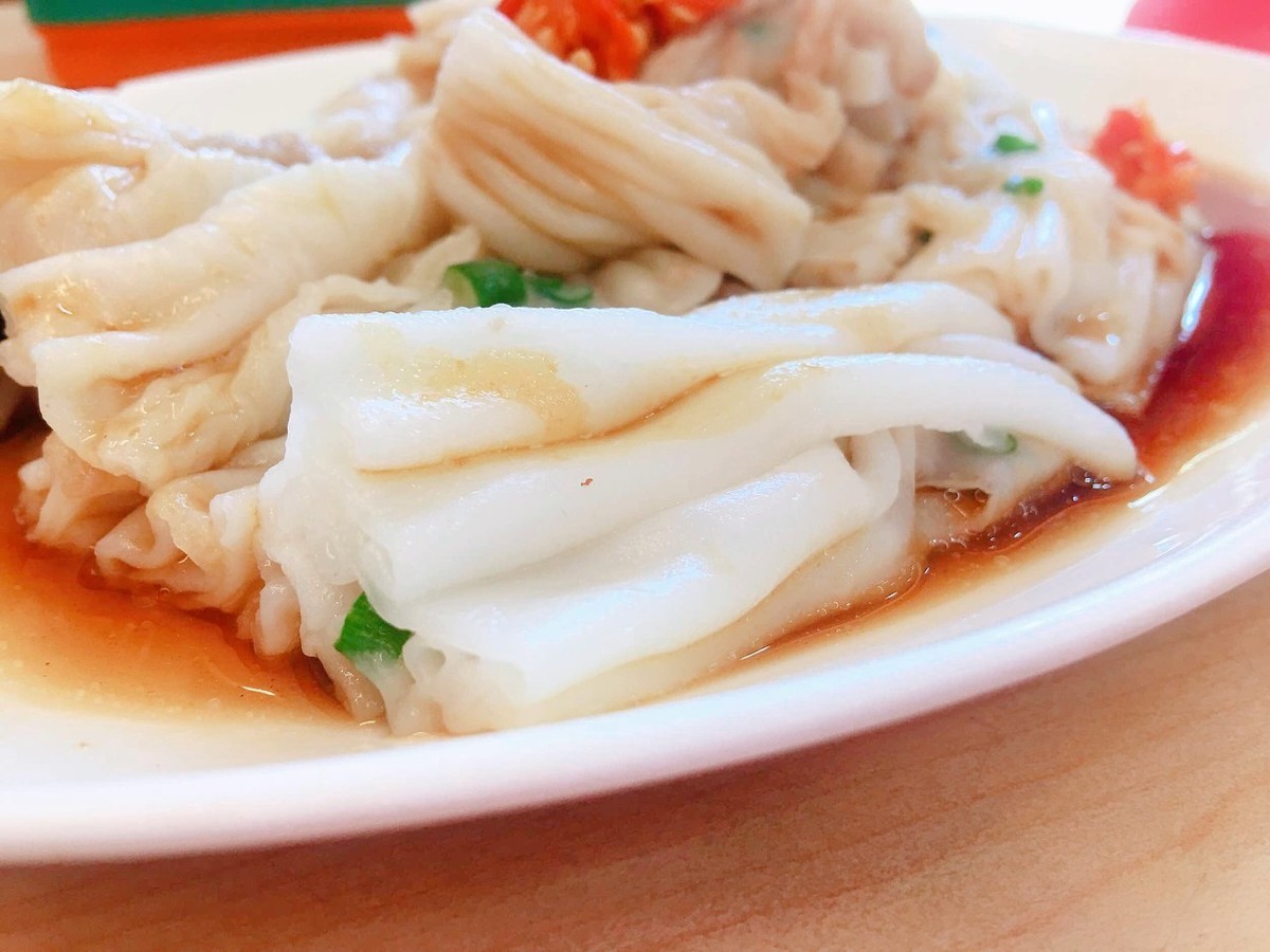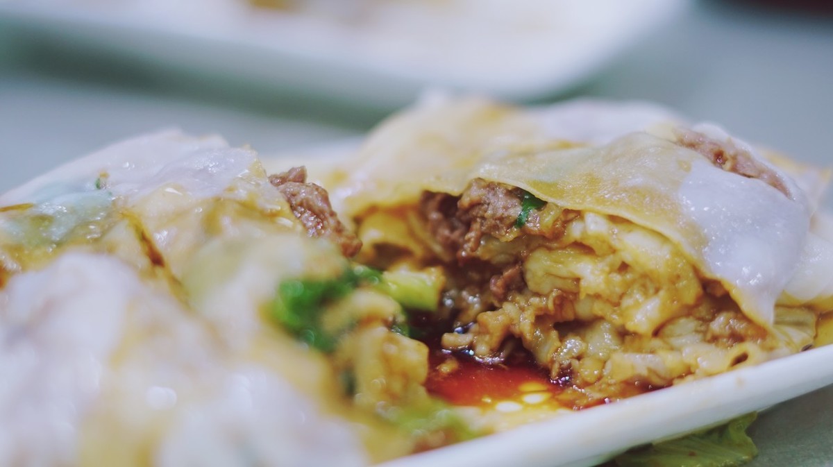 米浆弄好后,把磨好的米浆倒在一个特制的铁盘上面,摊成很薄的一层,蒸上数分钟即可,拿下后用铁皮刀刮下来卷成长条状,再切成几段,浇上肠粉酱汁,一盘薄韧香滑的肠粉就出笼了。