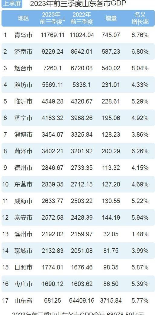 随着这些举措的推进,山东省将逐步形成“市市通机场”的大格局。当然,除了交通建设,山东省的各大城市的经济数据同样令人瞩目。截至2023年前三季度,山东省16个地级市的GDP排名中,青岛仍然稳居榜首,前三季度GDP达到11769.11亿元,成为全省的领头羊。济南位居第二,虽然还未突破万亿元的大关,但也取得了显著发展。临沂以4549.28亿元的GDP位列第五,成绩斐然。