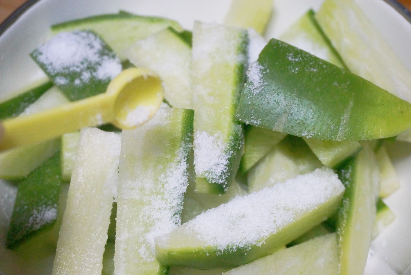 2.将萝卜先切成片,再切成条。萝卜条不要切得太细,因为还要经过晒干缩水,太细会影响口感。萝卜条中加入2克盐,腌制20分钟腌出萝卜中的水分。