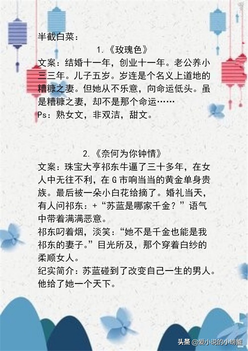 半截白菜呢一般都是熟男熟女,女主不是那种娇娇弱弱的类型,比较符合生活吧。喜欢这类的小伙伴也可自己找找看。