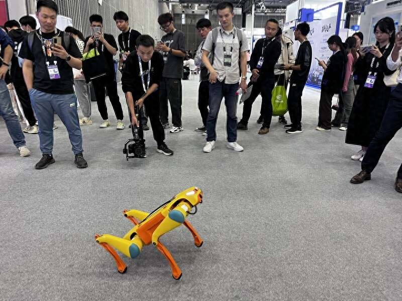 2023云栖大会上“机器狗”能够完成翻滚、跳跃、攻击等复杂动作背后,是软件程序和算法的升级、迭代。中青报·中青网记者 李剑平/摄