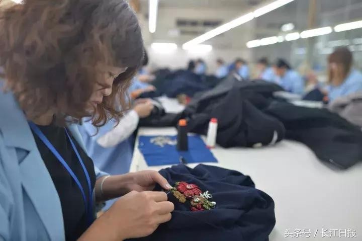 工人正在手工缝制衣服上的团花