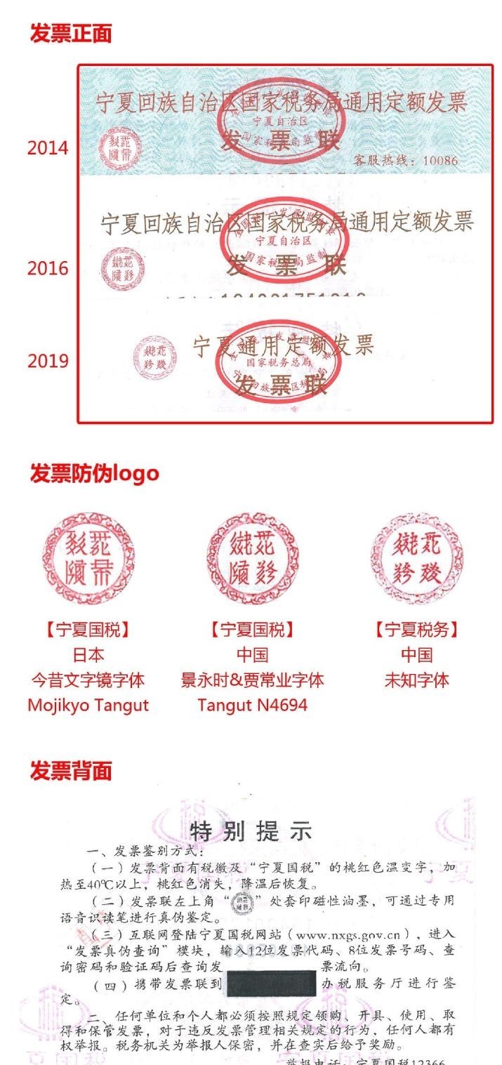 到现在,这种文字被破解释一些出土文物、墓碑拓片上的意思后,更多地将成为了一种文化记载,或是艺术存在,而且是地方性文化标志;(比如宁夏税务发票的防伪标志)