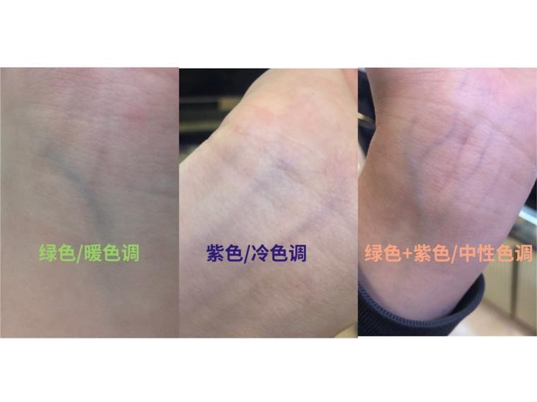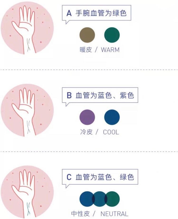 如果手腕静脉血管是绿色,那你就是暖调。如果手腕静脉血管是蓝色或者紫色,那你就是冷调。如果手腕静脉血管有绿色也有蓝色、紫色,那你就是中性色调。