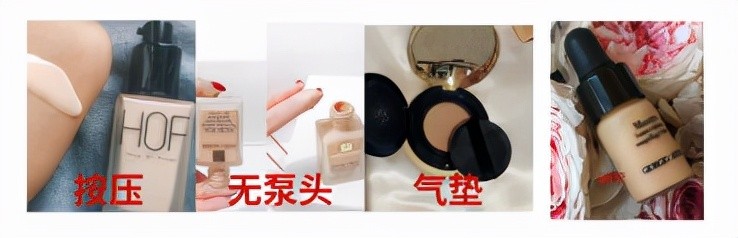 粉底液根据使用方式的不同又分为按压的、无泵头、滴管、和气垫的四种。
