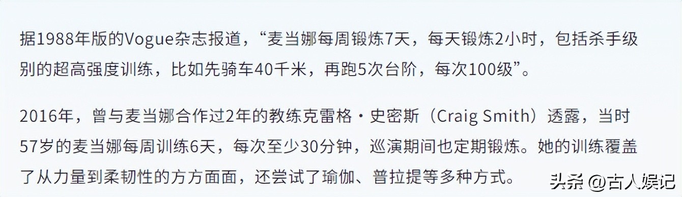 为了在演唱会上可以做高强度的唱跳动作,麦当娜始终保持着规律锻炼。