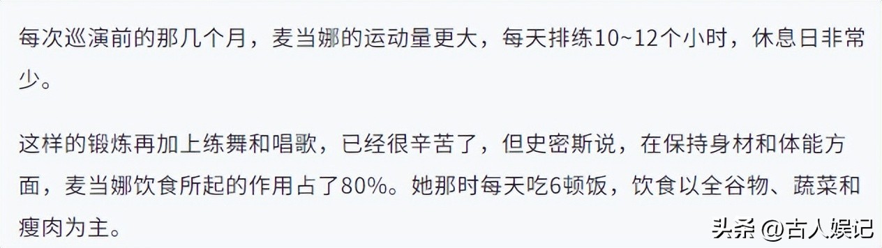 很早之前的她,便以疯狂的训练计划闻名,一天跑步锻炼好几个小时,就连巡演的时候,也会有私人的教练一起。