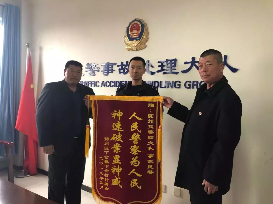 这是我第一次获得锦旗,也是我有史以来破获肇事逃逸案子速度最快的一次,从下午六点报案到将肇事车辆查获仅用了两个小时。下仓村党支部书记特意送来锦旗一面表达对我们的感谢。从警一年的时间,第一次获得如此荣誉,内心是满满的自豪感。