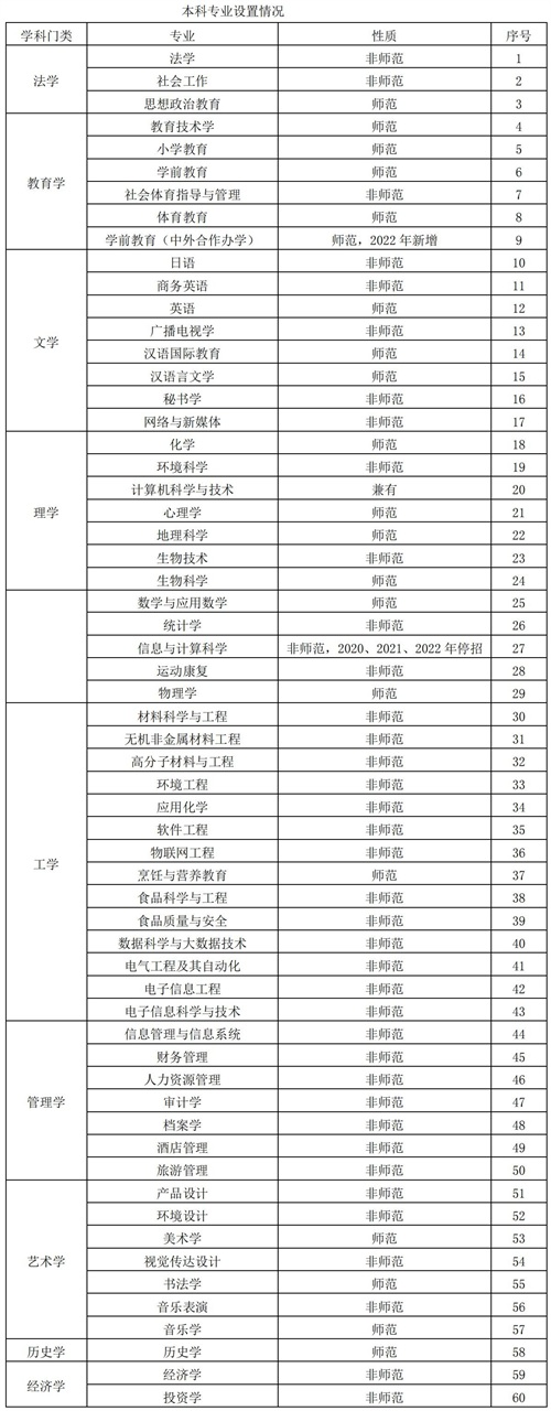 其次,要知道该校到底都有哪些专业。目前拿到的名单是,现有本科专业数 60 个,涵盖经济学、法学、教育学、文学、历史学、理学、工学、管理学、艺术学等 9 个学科门类,其中师范类专业 21 个,非师范类专业 39个。