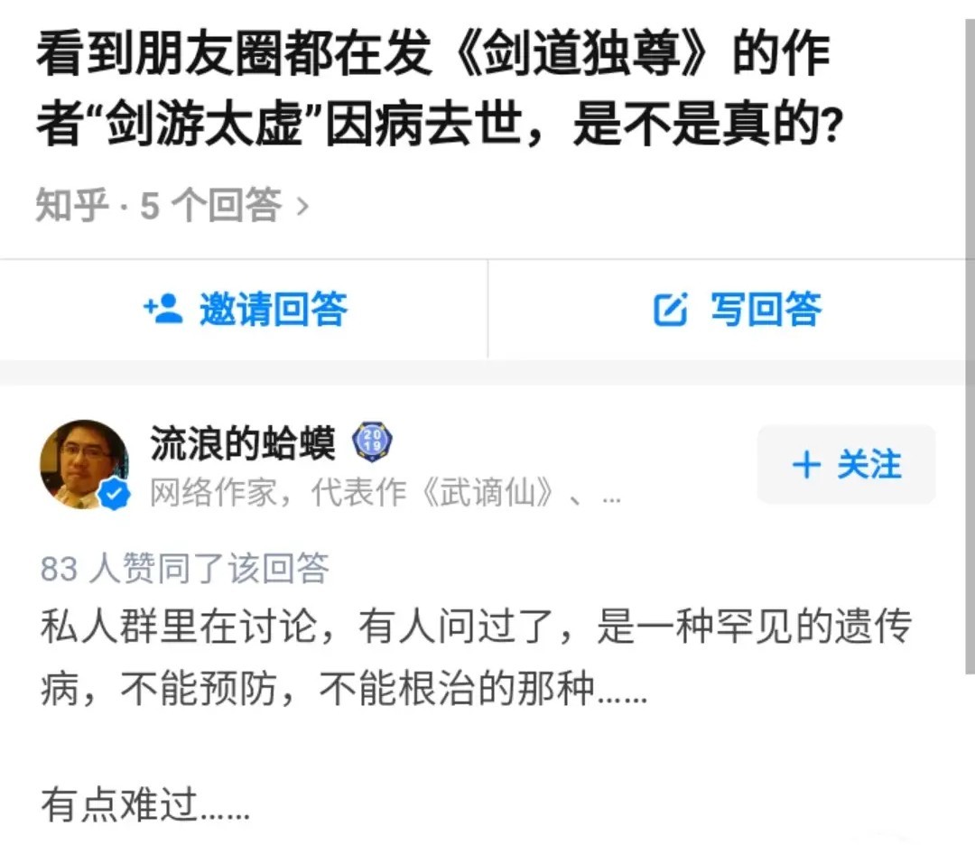 天妒英才,32岁网文界大神剑游太虚因病去世,曾写有剑道第一书