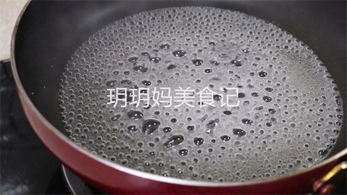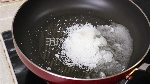 6,接下来是制作焦糖部分,往锅里倒100克白糖,50克清水,开大火烧至冒泡泡,记住千万不要用筷子去搅它