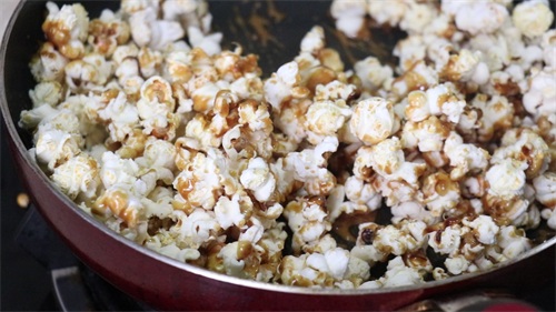 9,搅拌均匀,将爆米花倒进去,翻拌均匀,使每一个爆米花上都沾满糖浆