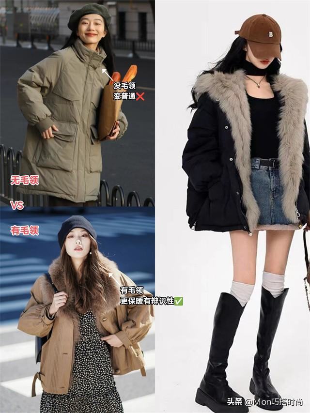 一定要选有大毛领的派克服,不仅上身保暖,还超有辨识度。毛领的甜美软糯与派克服工装元素结合,颇有甜酷的反差魅力~