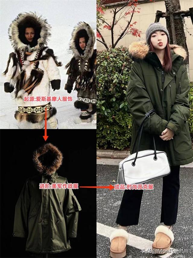 派克服的灵感来源于生活在极寒地区的爱斯基摩人,被美军改良后作为作战服出现,后登上杂志《Vogue》作为时尚单品流行开来。派克服独特的经历注定了它保暖耐穿、时尚。