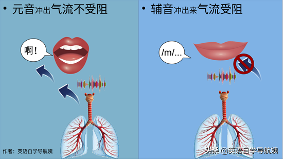 元音辅音差别就在于声音冲出来的时候。 我们的嘴皮和舌头有可能阻止声音冲出来,也有可能给声音“放行”。 这个就是元音发音和辅音发音的区别。