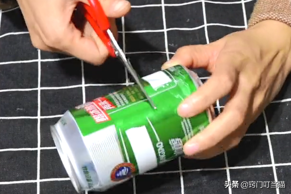 第一步、首先我们准备一个喝完的易拉罐,用剪刀在易拉罐的底部位置剪一刀,剪开后再修剪一下就可以了。