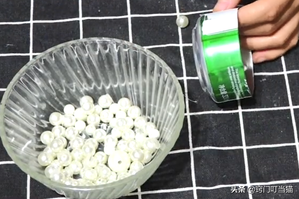 第二步、然后准备一些好看的小珠子,用热熔胶将小珠子粘在易拉罐的周围,如下图所示这样粘好就可以了。