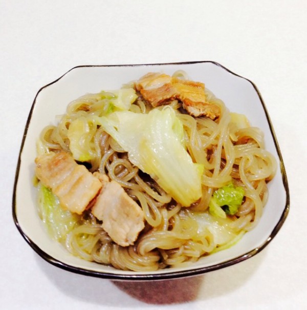 五花肉100克、粉条60克、白菜200克、花生油适量、酱油10克、盐3克、姜3克、葱10克、水350克