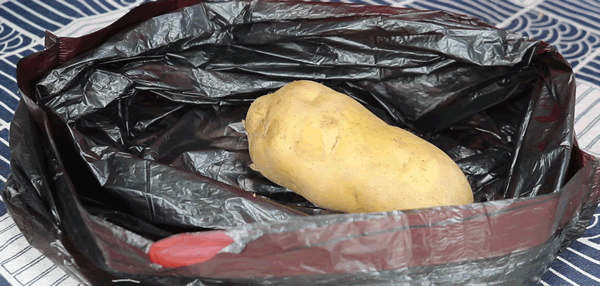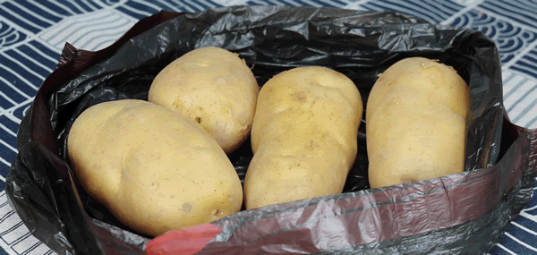 另外一点就是一定要选择黑色的塑料袋,因为它可以遮光,避免土豆继续发生光合作用,那样就不会发芽了。加入土豆之后咱们再加入一个熟透的苹果,然后排出袋子里面的空气,将收口扎紧放到阴凉通风的地方保存,这样可以让土豆保存一个月都不会坏,这个方法可以大量保存土豆。