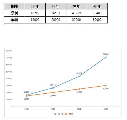 看到这一点,你可能还是觉得复利没那么厉害(本利和只多了1289元)。但请继续往下看:如果投资期限分别延长到20年、30年和40年,会发生什么?