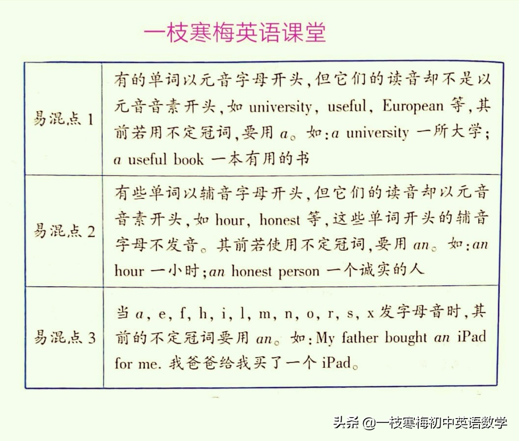 【注意】在使用不定冠词a和an时,要特别注意以下几个易混点: