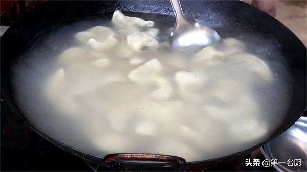 然后舀一勺凉水添入锅中,等锅中的水不再沸腾时,饺子皮已经定型了,用勺子轻轻地推动两下,注意不要用勺子挖,使饺子慢慢分开。