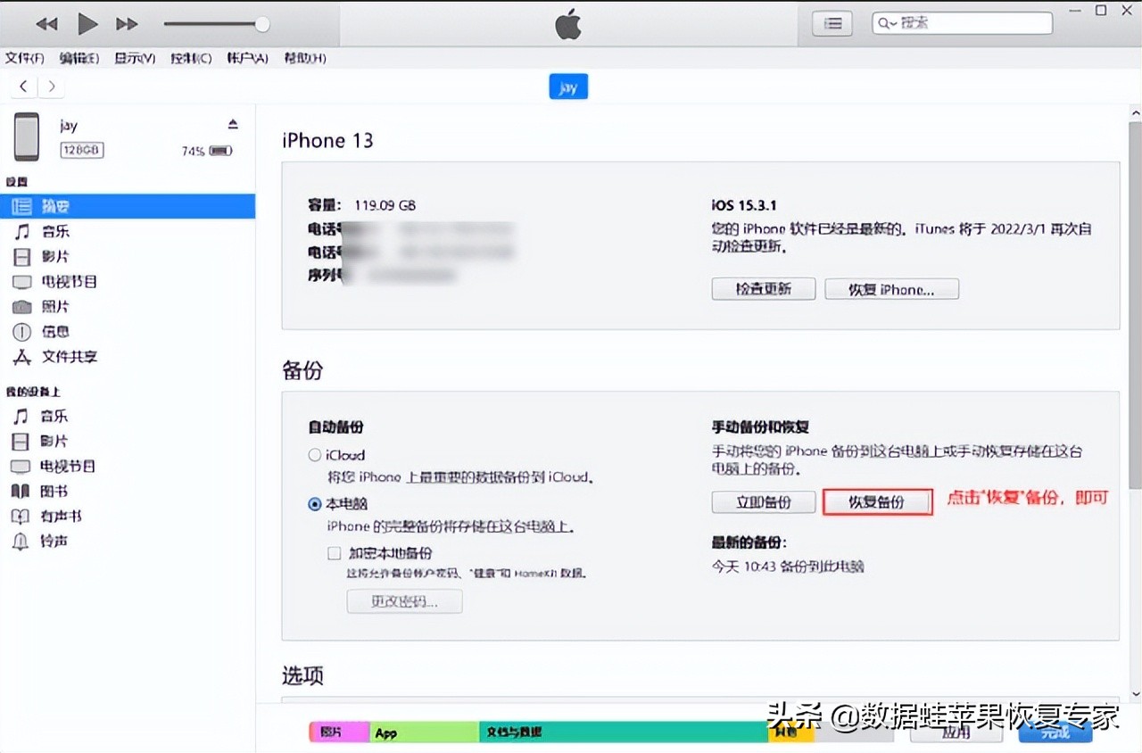 注意:iTunes恢复的数据和设置会将现在的数据和设置全面覆盖掉。