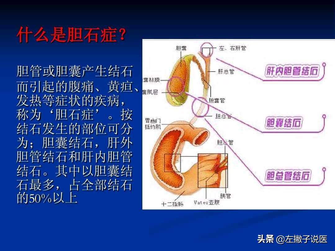 胆结石,顾名思义就是胆囊或者胆管里面生了石头,从而引起腹痛、黄疸、发热等症状的疾病。而这个胆结石按照发生的部位我们又可以分为胆囊结石、肝外胆管结石和肝内胆管结石。从我国80年代初全国调查结果来看,胆囊结石发生率约为52.8%,肝内胆管结石为36.2%,胆总管结石为11%。
