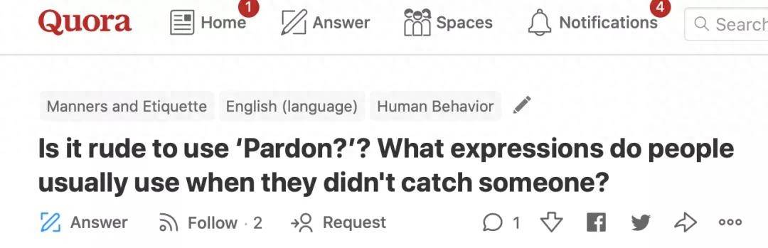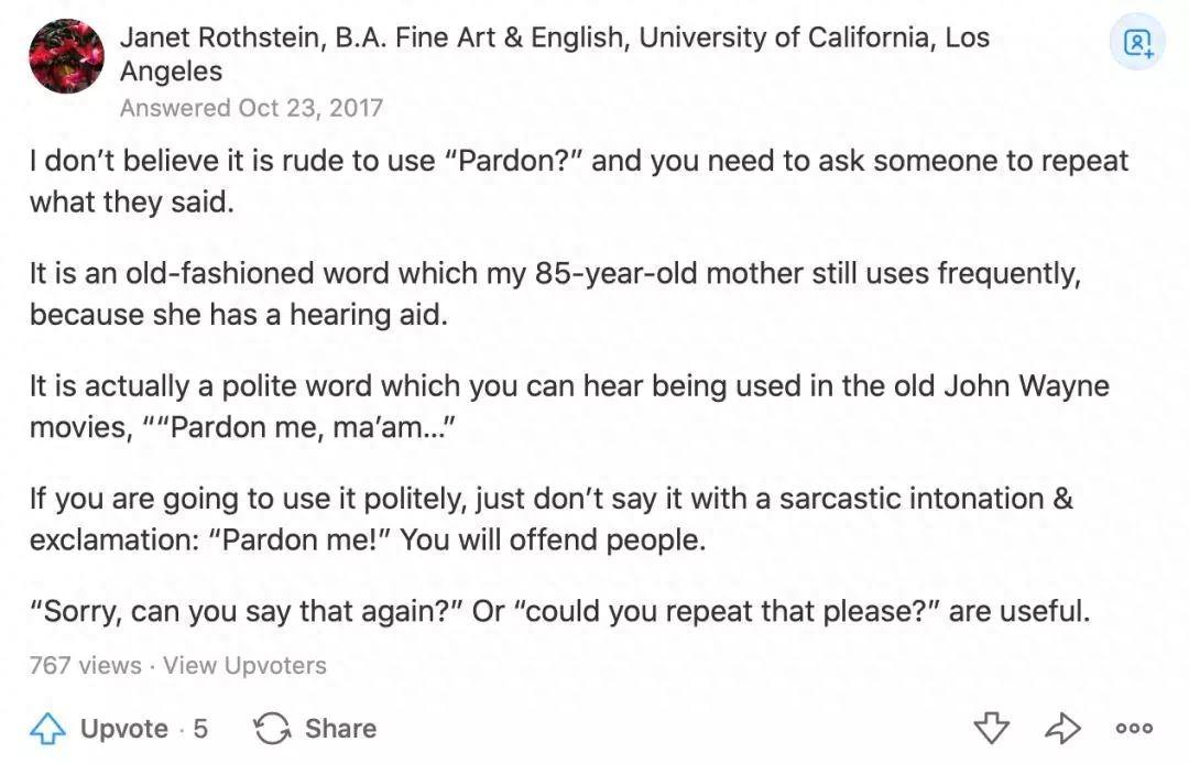 在号称“美国版知乎”的Quora上,也有人提过这个问题:“没听清对方话时,使用pardon是否显得粗鲁?”