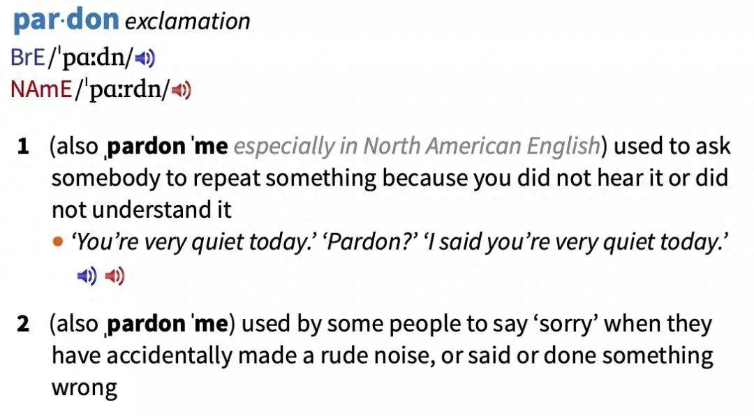 pardon来自于法语,本意为“原谅”,相当于“forgive”。英国人喜欢单用一个pardon,而北美地区的人喜欢用pardon me或者I beg your pardon,字面意思是“请原谅我”、“我请求您的原谅”。