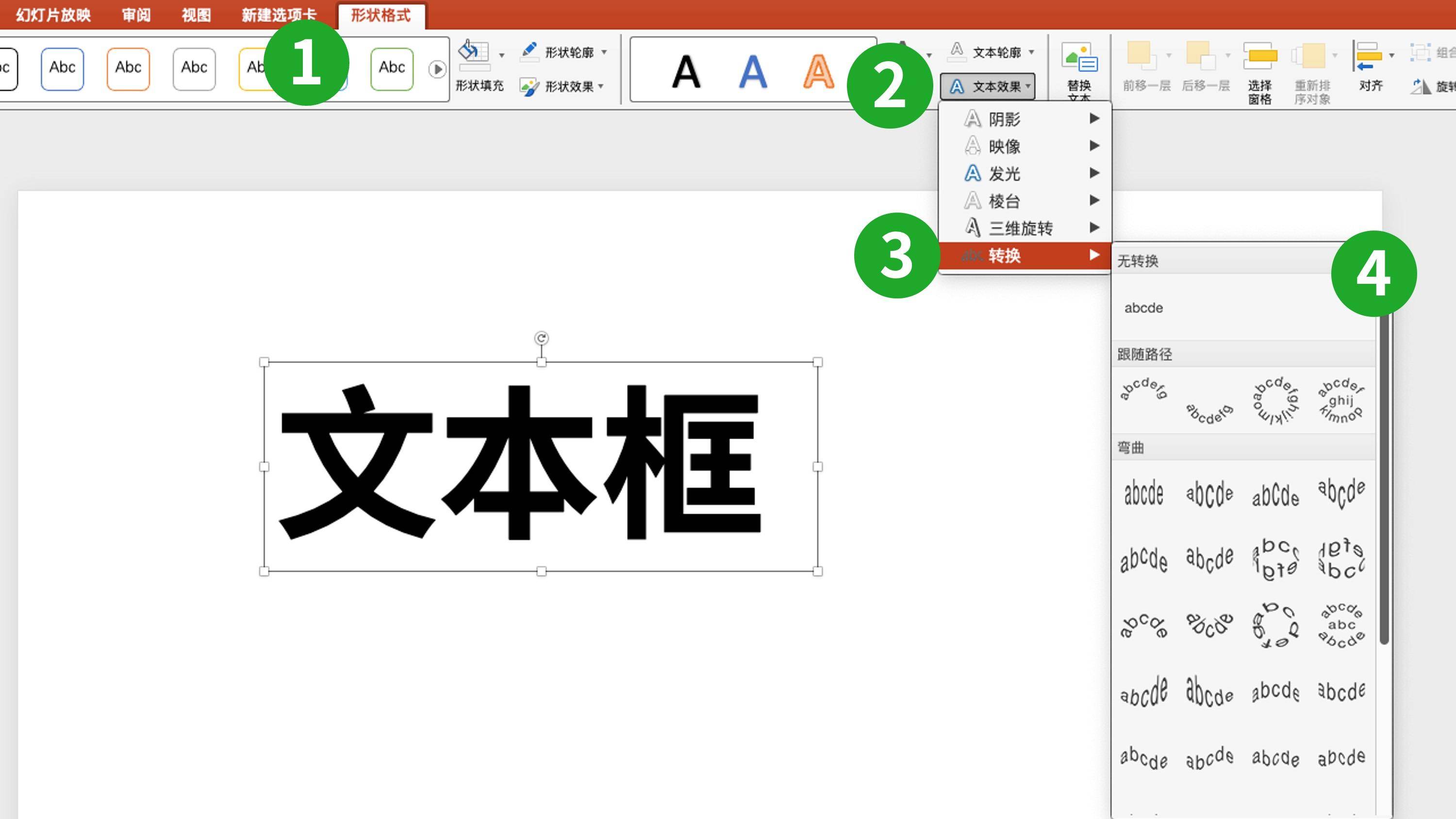 当我们选中文本框,【形状格式】→【文本效果】→【转换】,便可以看到各种效果的文本框。