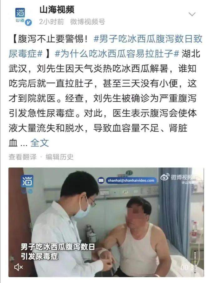 2022年,湖北武汉的一位刘先生因天气炎热吃冰西瓜解暑,谁知吃完后就一直拉肚子,甚至三天没有小便,这才到院就医。经查,刘先生被确诊为严重腹泻引发急性尿毒症。