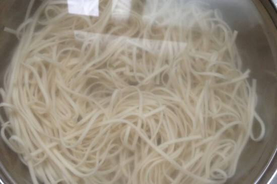 捞出锅的面条要过一下冷水,这样面条的口感会更劲道,如果牙齿不好或者是消化慢的人可以直接捞出食用,这样面条会更软。将面条过水后沥干水分,装入碗里备用。
