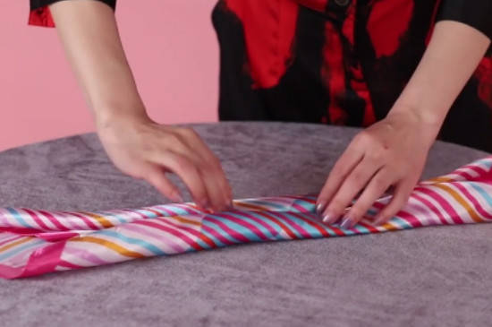 将丝巾平铺在桌面后,将丝巾的两个角分别向中间卷起形成条状,之后将卷好的丝巾围在脖子上,再把丝巾打两个活结形成平结并略微整理即可。