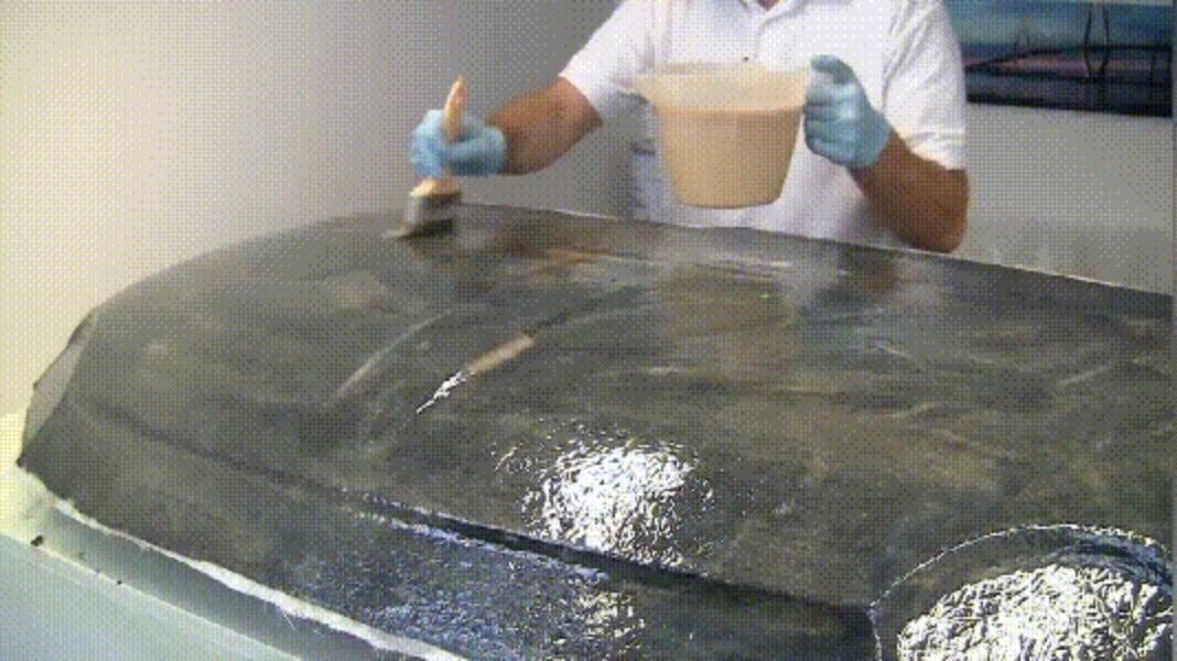 手糊成型法是将基体树脂涂抹在有脱模剂的模具上,再铺一层玻璃纤维,然后用刷子将纤维均匀的铺在树脂上,如此反复几次,直到达到需要的厚度。它适用于多品种小批量产品的制作。