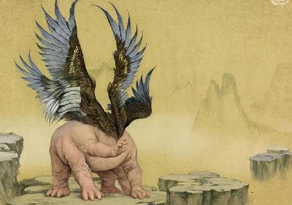 人面鸟身,耳挂青蛇,手拿红蛇,十二祖巫之一电之祖巫翕兹。