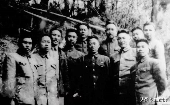 图片说明:1951年,中国人民志愿军第九兵团部分指战员在朝鲜江源道紫霞洞兵团指挥所前合影,左二为彭德清。