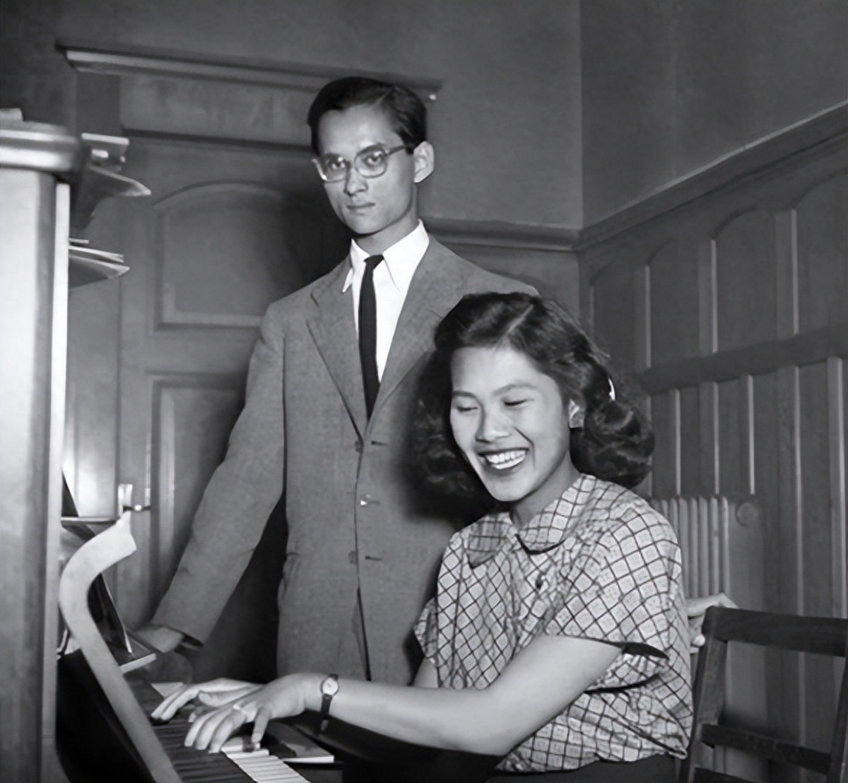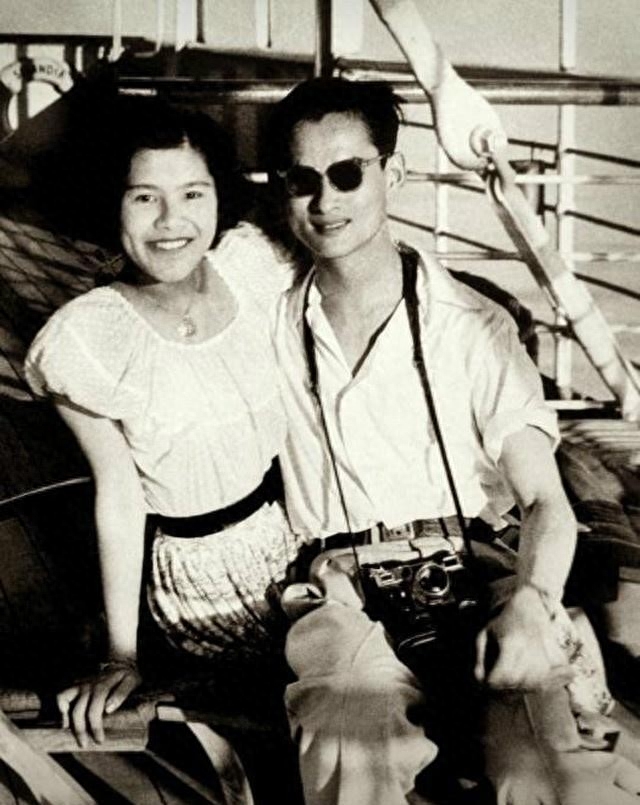 当年普密蓬国王也算得上端正大气,身材细高,金丝眼镜,一副儒雅之风。