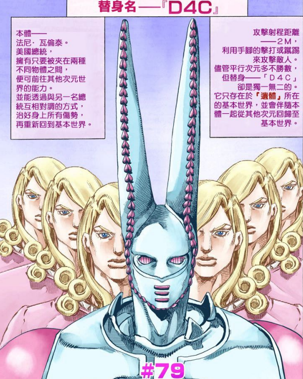 由于能对维度本身进行干涉,空间系替身也是相当BUG的存在。而在JOJO系列先后登场的几位空间系替身当中,能力最为变态恐怖的当属第七部BOSS大总统的替身D4C。