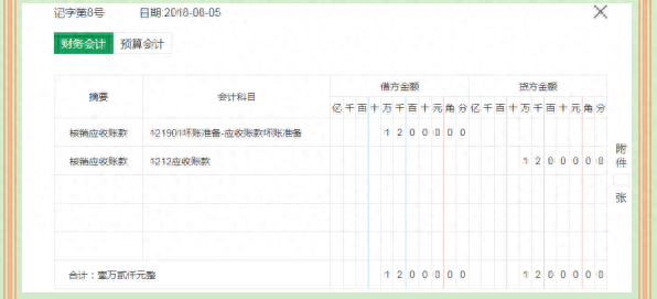 案例:8月5日,对应收账款的账龄进行分析,发现逾期3年没有收回的应收账款12 000.00元,同时上报财政部门审批,将其核销。