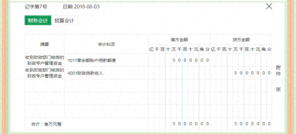 案例:8月3日,收到代理银行转来的“授权支付到账通知书”,财政部门通过授权支付方式核拨的财政专户管理资金30 000.00元已经下拨到单位的零余额账户。