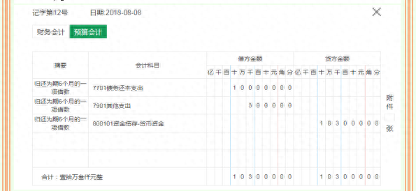 案例:8月8日,单位归还从建设银行借入的为期6个月的一项借款100 000.00元,并支付利息3 000.00元。