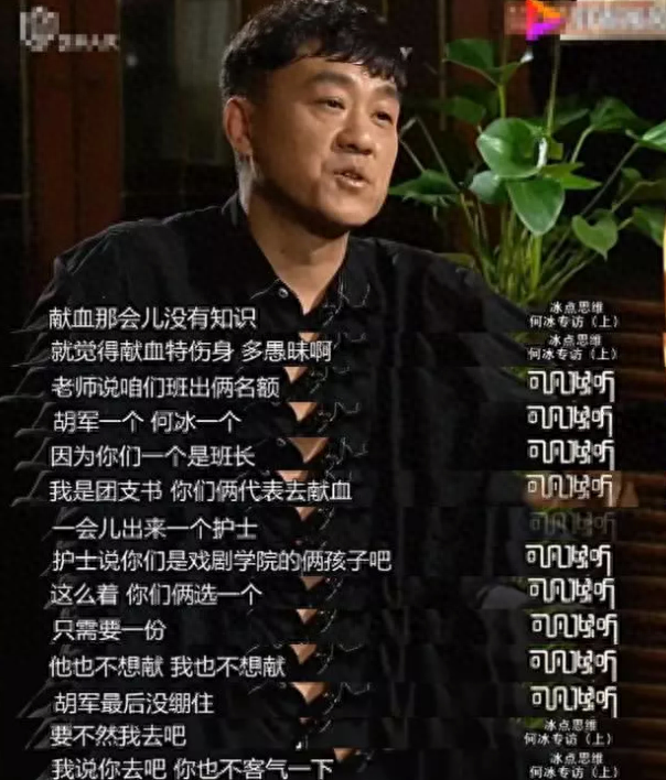 期间还说道两人在大学时期的一个趣事,因为学校安排要去献血,而胡军和何冰作为班级里的班干部,做到带头作用就被老师安排去献血,可是去了之后护士说只需要一人,你们两商量一下,当时两人都有点不想去。