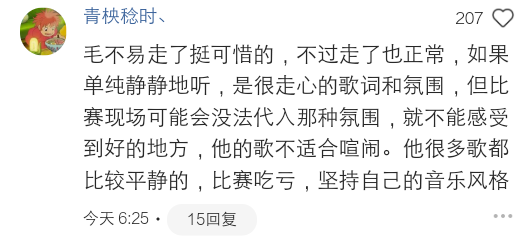 "毛不易走了挺可惜的,不过走了也正常,如果单纯静静地听,是很走心的歌词和氛围,但比赛现场可能会没法代入那种氛围,就不能感受到好的地方,他的歌不适合喧闹。他很多歌都比较平静的,比赛吃亏,坚持自己的音乐风格"