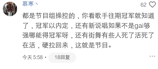 "都是节目组操控的,你看歌手往期冠军就知道了,冠军以内定,还有新说唱如果不是gai够强哪能得冠军呀,还有街舞有些人死了活死了在活,硬拉回来,这就是节目。"