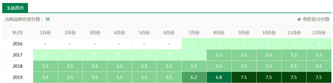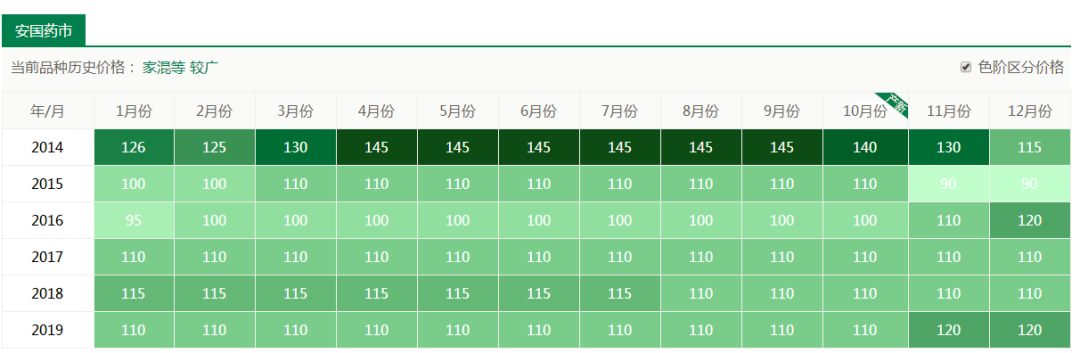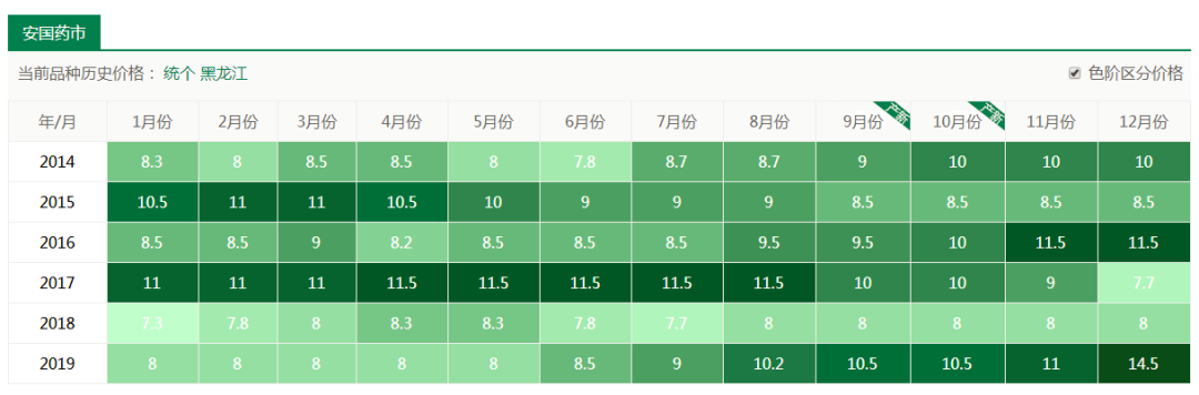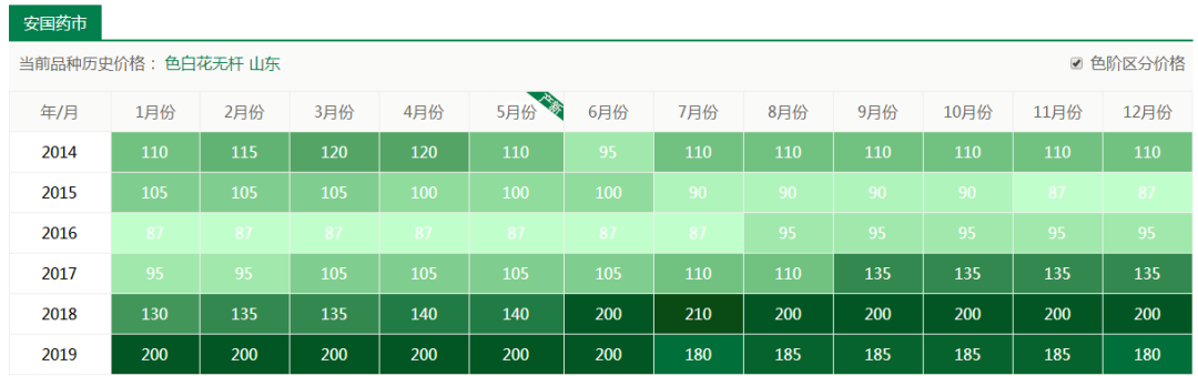 从图中可以看出近5年来金银花价格总体呈上升趋势,今年平均价格稳定在180元/公斤以上。总体来说种植风险小。