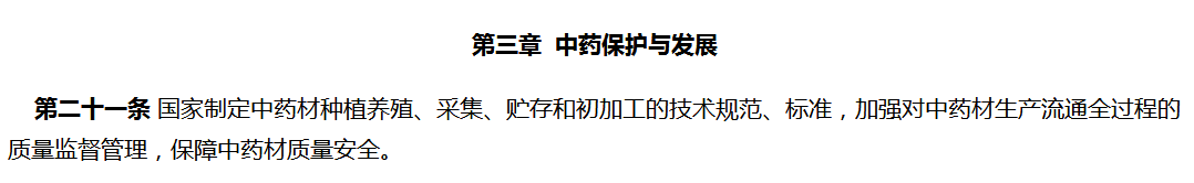 2017年7月1日,《中华人民共和国中医药法》正式实施,其第三章《中药保护与发展》中就明文表示以法律保障中医材的种植与发展。