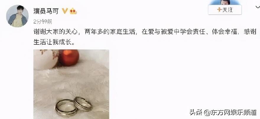 28日,马可在微博上晒出婚戒宣布结婚:“谢谢大家的关心,两年多的家庭生活,在爱与被爱中学会责任、体会幸福,感谢生活让我成长”。消息一经发出便收到了来自娱乐圈好友们的祝福。