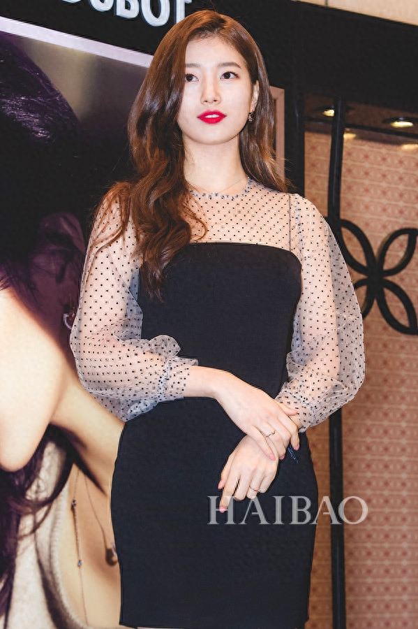 裴秀智2018年1月31日Dahong透视拼接连衣裙现身代言活动