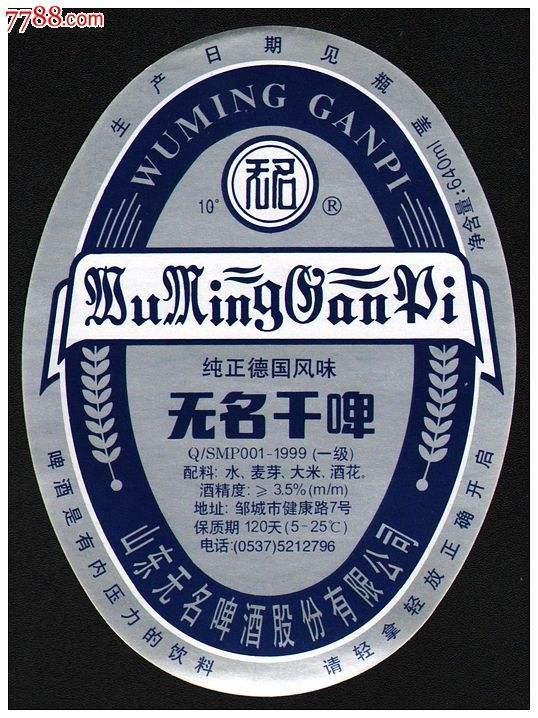 无名啤酒是济宁邹城产的,当年它的广告词很拽,叫“甘泉深埋本无名,风沙吹尽始见金。无名啤酒。”后来被燕京收购,据说这酒劲头挺大,喝了头晕,有“夺命8度”之称。